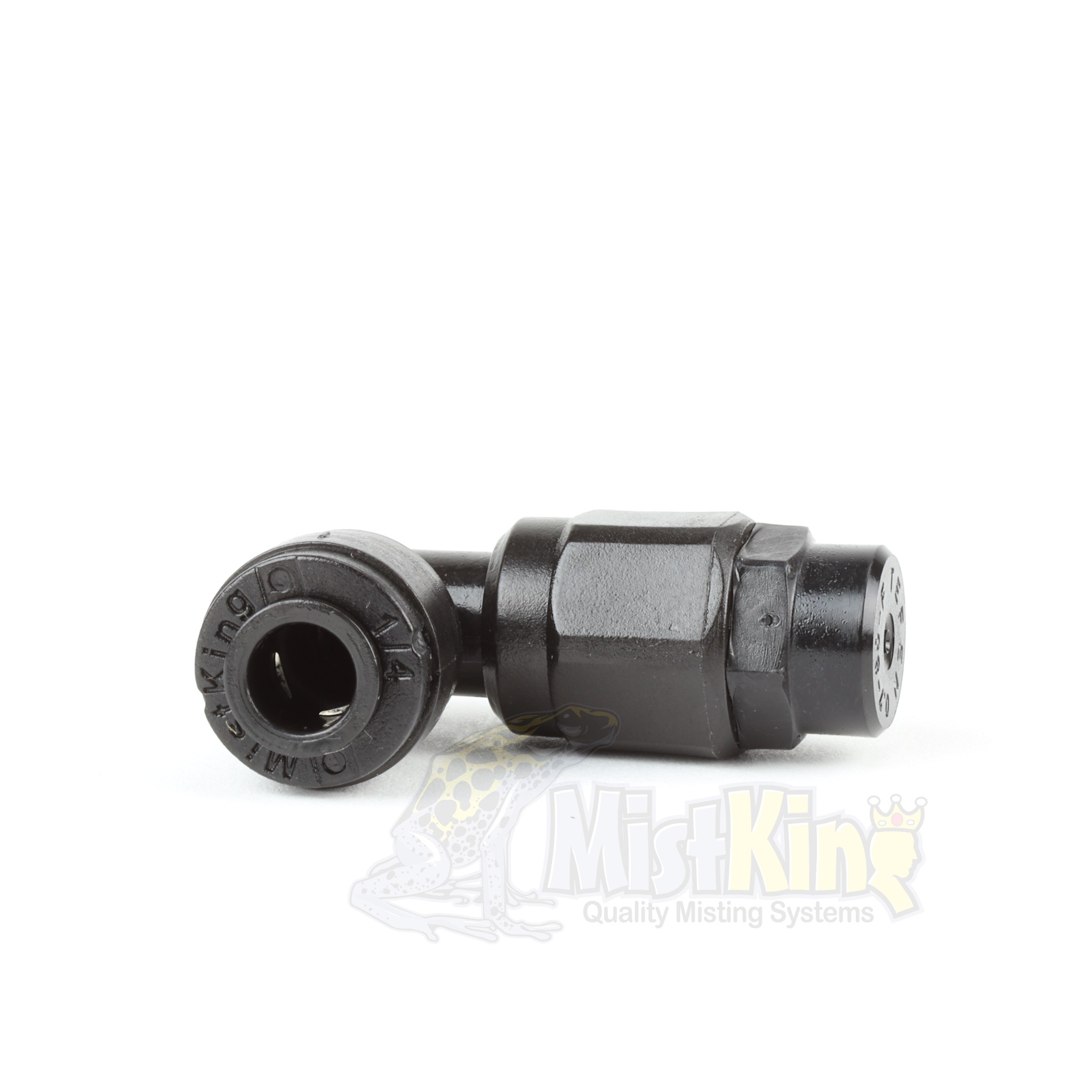 Ideal for spots where adjustability is not a must. You can still swivel the fitting on the tubing up and down but cannot move this nozzles to the sides. Meant to be suspended by the tubing. This is ideal nozzle for patio cooling or hobby greenhouses or growing benches. The "L" nozzle is meant to finish a chain of "T" style nozzles.